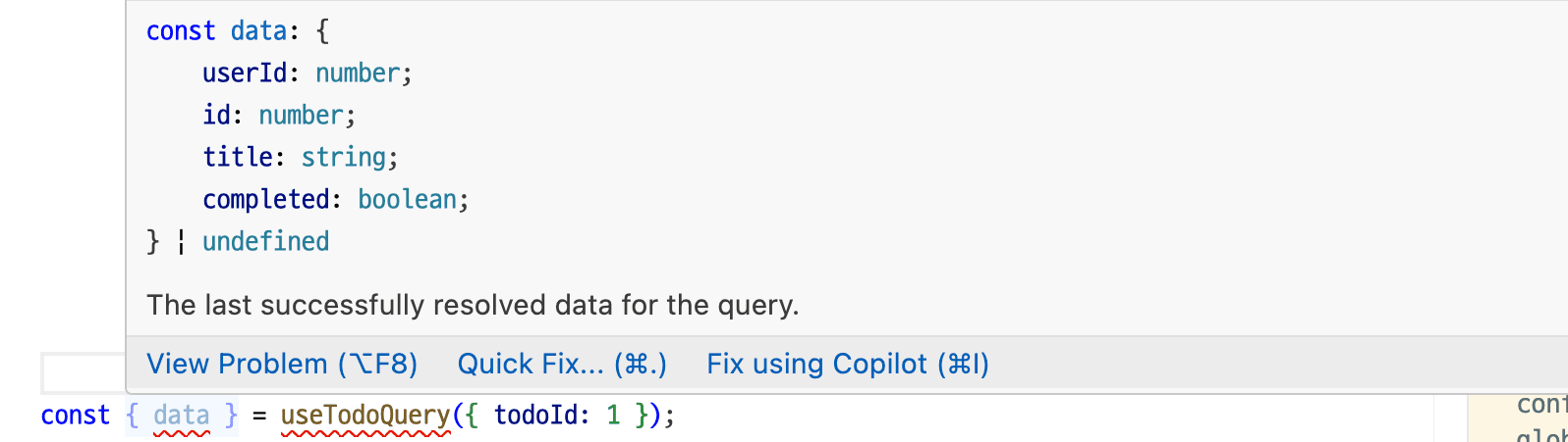useTodoQuery를 사용한 결과 그 data는 아래와 같이 타입이 잘 잡힌다는 걸 확인할 수 있습니다.